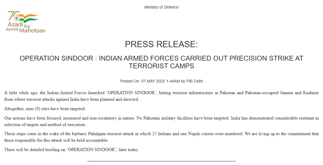 INDIA GOVT: NINE SITES TARGETED AS PART OF ‘OPERATION SINDOOR’ INDIA GOVT: "OUR ACTIONS HAVE BEEN FOCUSED, MEASURED AND NON-ESCALATORY IN NATURE"