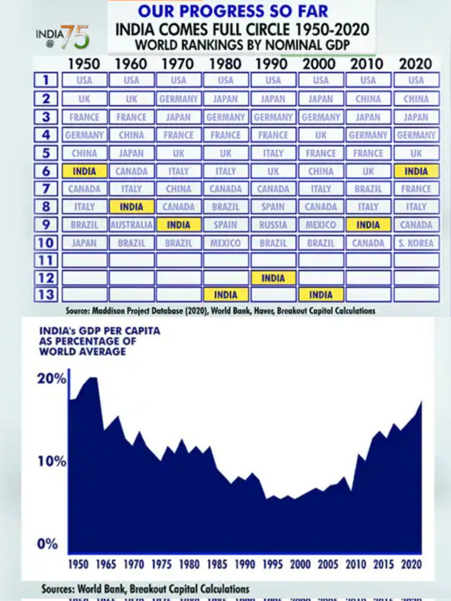 Indian GDP ranking was in top 7 before 1950 and after 70 years came back in 2020's
