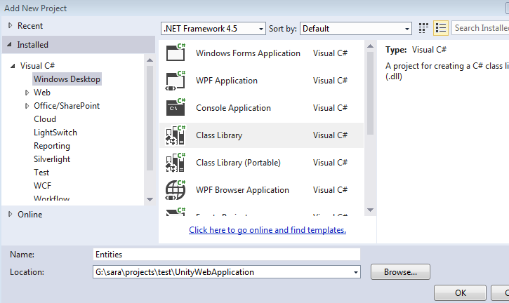 Let's update our sample application now, first I'll add two another Class Library projects called Entities and Services. There Entities project holds all the entity (model) classes we are going to use and Services project will be used to put our service classes.