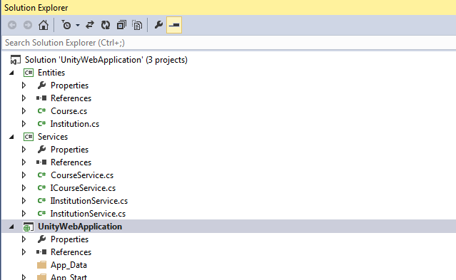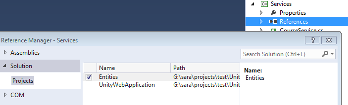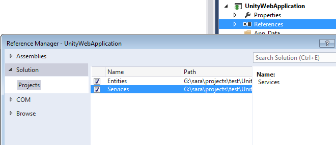 We need to add references to Entities and Service projects within Unity Web Application before we continue.