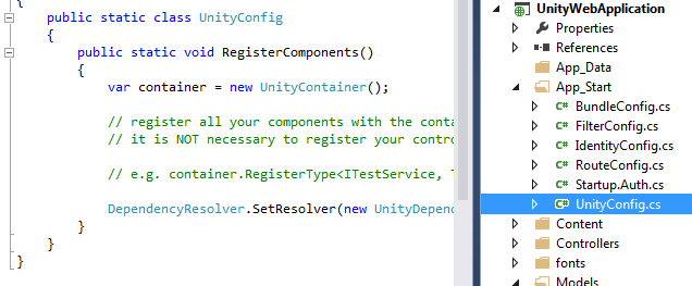 After completion if you check the Solution Explore, you can see newly added UnityConfig class inside App_Start folder. That's where we register all our components with the container.