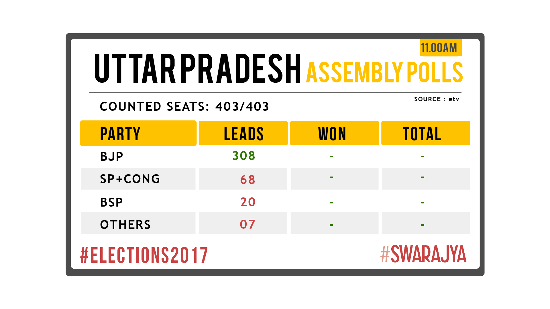 sid_22 Posted March 11, 2017 Report Posted March 11, 2017 BJP+ 325 +273 -16 SP+CONG 56 -194 +3 BSP 19 -62 +9 Others 4 -17 +4 Quote